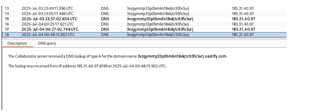 outbound DNS interaction captured on Burp Collaborator, which revealed an internal IP