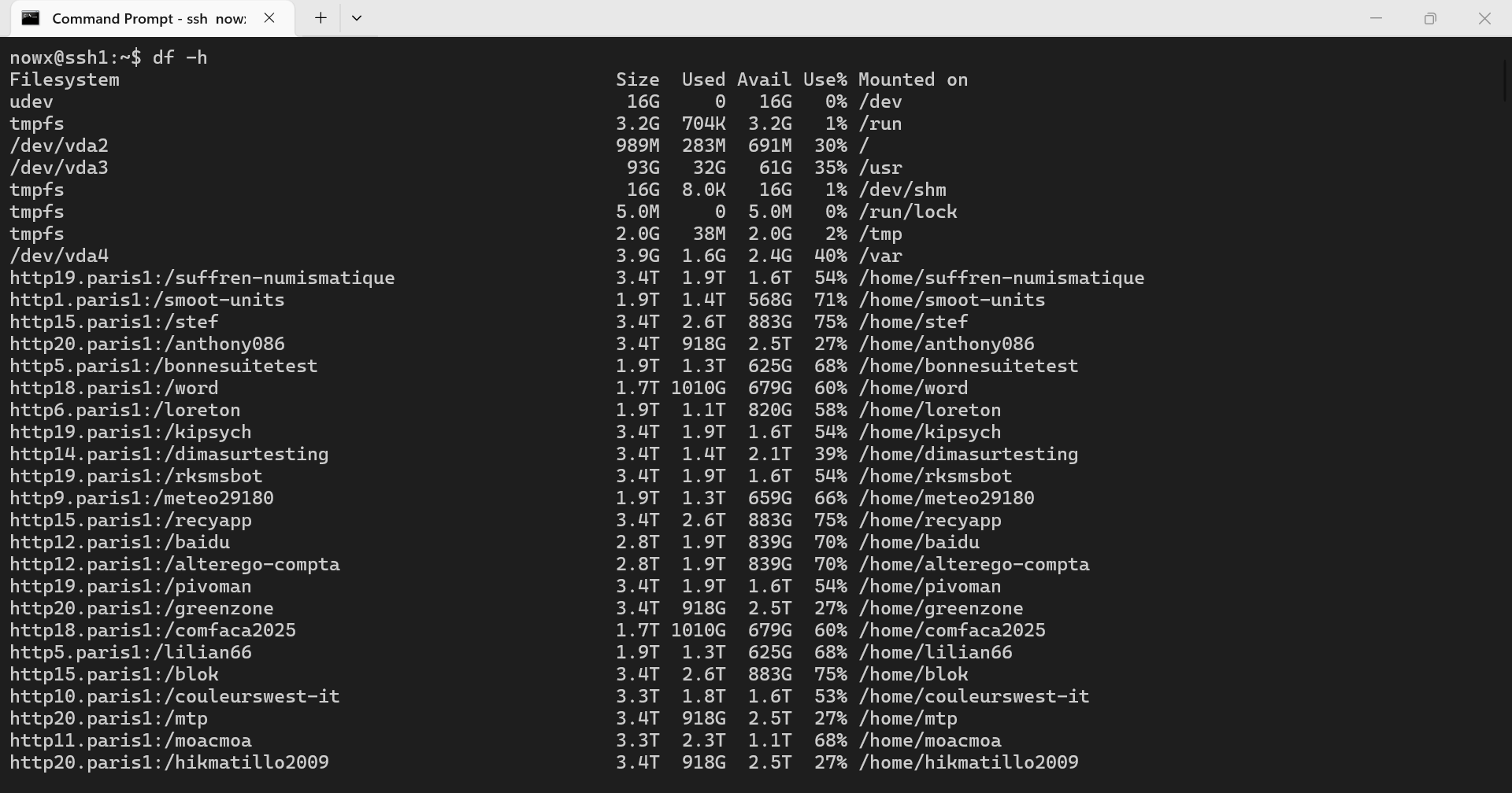 After logging into my account via SSH and running `df -h`, I can see multiple mount points such as /home/<username> that are not associated with my account. These seem to correspond to other users hosted on the same infrastructure.